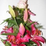 Růže, lilie, gerbery v proutěném korpusu a zeleň